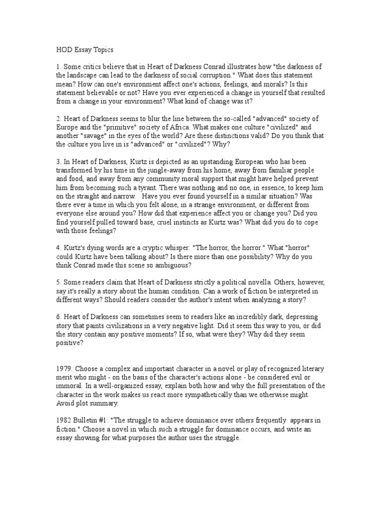 The Hypocrisy of Imperialism. Heart of Darkness explores the issues surrounding imperialism in complicated ways. As Marlow travels from the Outer Station to the Central Station and finally up the river to the Inner Station, he encounters scenes of torture, cruelty, and near-slavery Aug 25, · Tips for Choosing the Best Topics. In writing there is nothing more important than the essay topic you choose. The essay topic idea is the backbone of your paper, and if it is weak, it will be extremely difficult for you to succeed Get ready to ace your Heart of Darkness paper with our suggested essay topics, helpful essays about historical and literary context, a sample A+ student essay, and